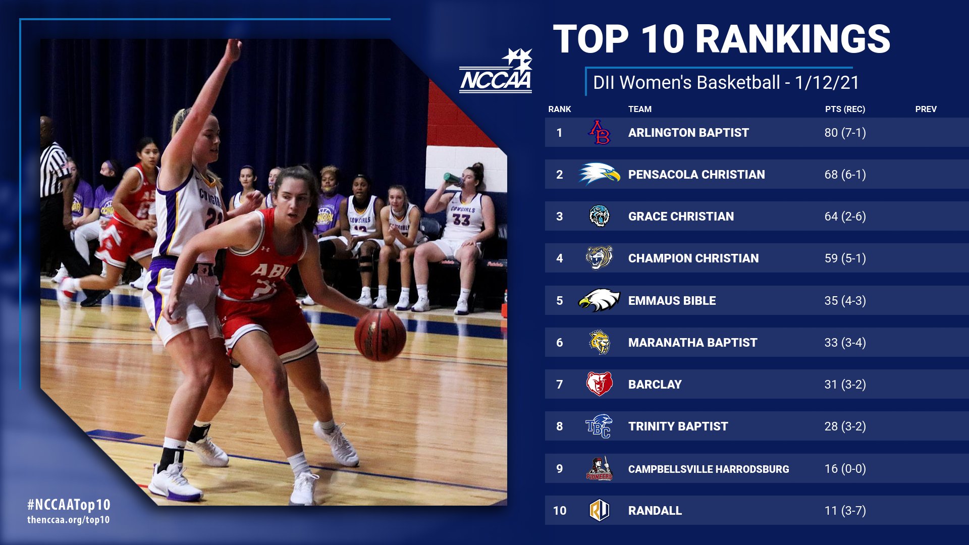 Also receiving votes: Calvary (6), Bob Jones (3), Johnson FL (3), Ozark (3)