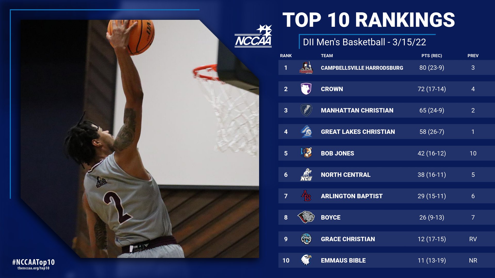 March 15, 2022 Also receiving votes: Toccoa Falls (10), Champion Christian (1), Southwestern Adventist (1)